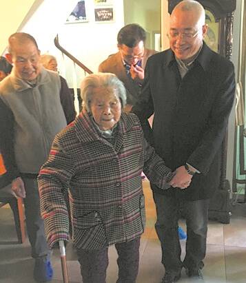 在儿子的搀扶下,林华英老人拄着拐杖一步一步走出客厅,步伐依然有力、自如,她坚持按照自己的习惯,坐在自己平时吃饭的地方。