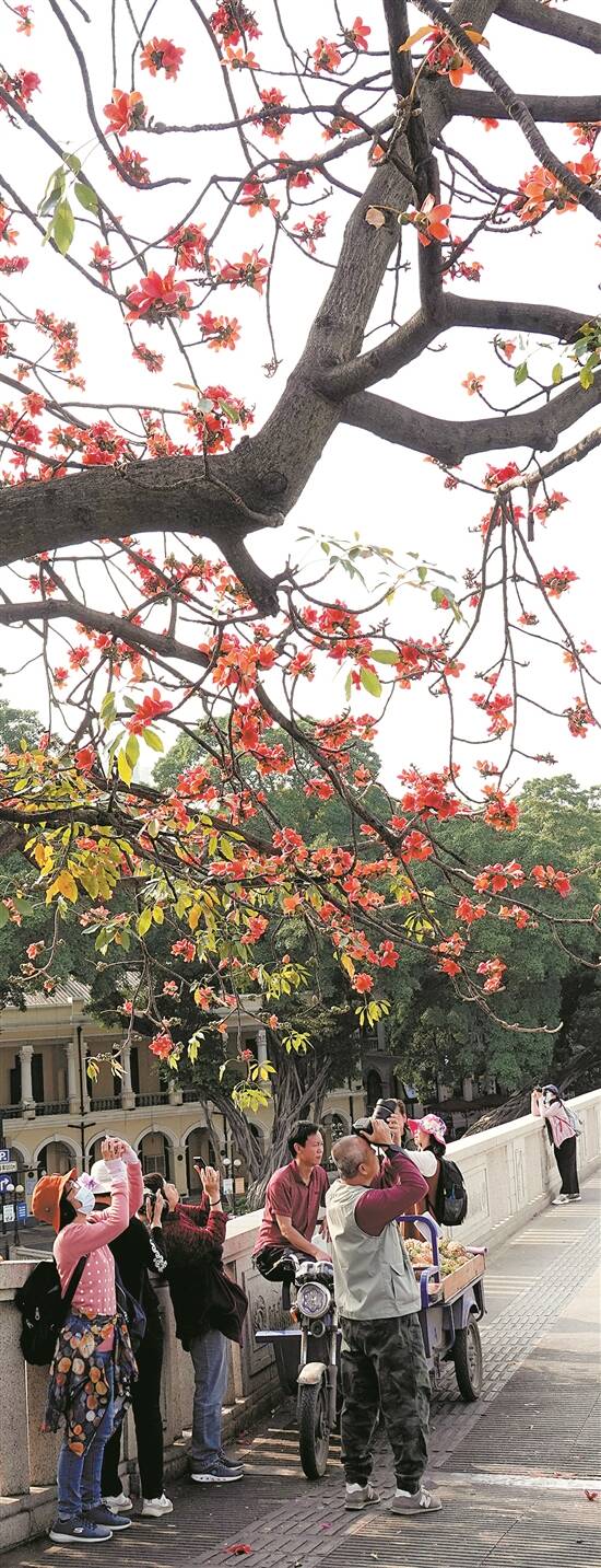 红艳艳的花朵挂满树,有的花枝伸展到人行道上,和过往行人亲密接触,吸引了众多市民。
