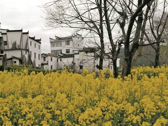 油菜花与这里的白墙黛瓦、翘角对称的建筑非常搭配。远远望去,一大片鹅黄簇拥着粉白民居,田头桃红三两株,燕子呢喃上下飞,那种视觉效果像靓衫配上彩裙,简直动人心魄哪。油菜花完全不受阴雨绵绵的影响,无论阴晴,长在哪里就把哪里映得亮堂。难怪有人说,油菜花是一种阴晴皆宜的“光明花”呢。