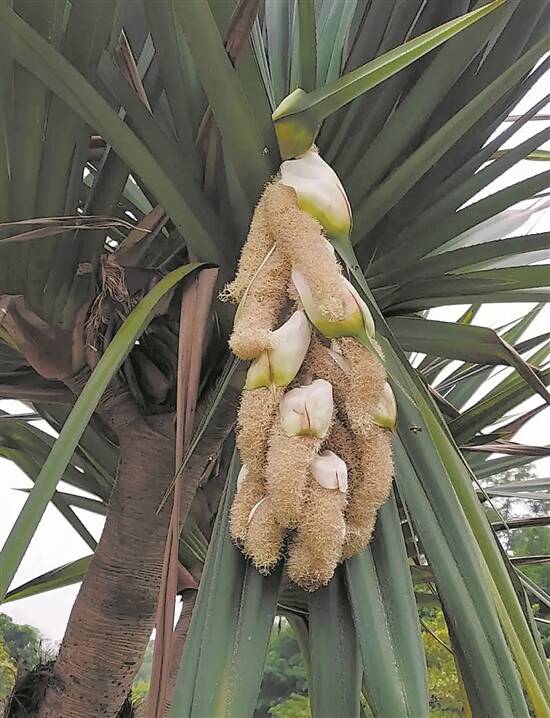 红刺露兜又称扇叶露兜,原产非洲马达加斯加,开花分雄株与雌株,姿态各不同。广州华南植物园的红刺露兜在露兜岛上定植以来,雄株还是首次开花,淡黄色的花序就像悬挂着的一串大型珍珠吊坠,吸引了不少游客,也有众多蜜蜂前来探访。其雌株则在2019年曾经开花结果,今年也有开花,但比雄花稍后。