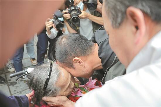 谭先生紧紧地抱着年迈的姑姑并深情地亲了老人家的额头和脸