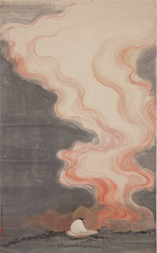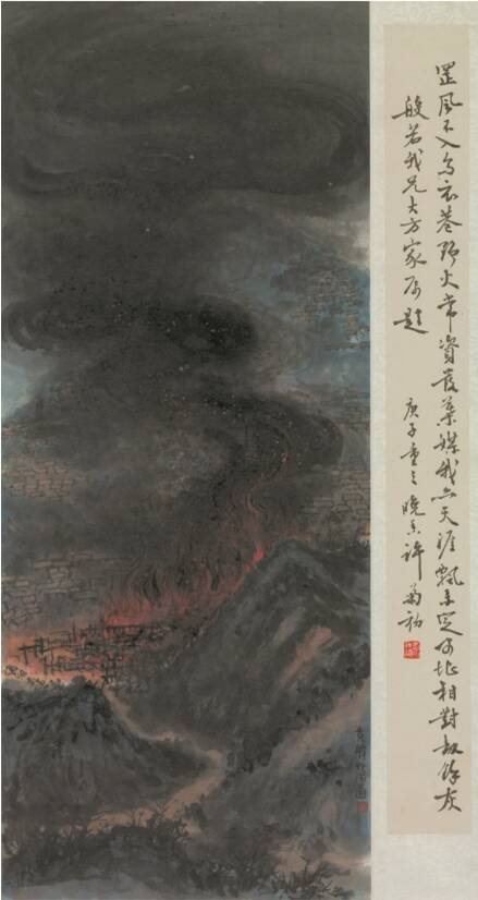 居港期间的黄般若走出摹古,从艺术技法和题材上均形成个人风格。本次展览特别展出了来自香港中文大学收藏的《木屋之火》。黄般若多次以火烧木屋,以火迫迁的惨景作为创作题材,《木屋之火》可谓代表之作,直接反映香港上世纪50年代发生的九龙石硖尾木屋大火。