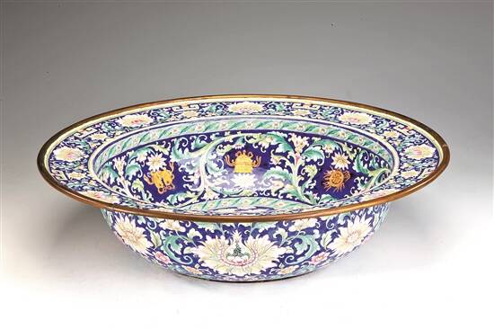 广东省博物馆藏的清乾隆铜胎画珐琅云龙八宝脸盆,高12.5厘米,口径为43.5厘米。器物为圆形脸盆,折口沿,边线卷口鎏金,腹微鼓,足底平。整个盆以画珐琅装饰,盆内外均以宝石蓝色为地,口沿反面和盆底则素白无纹。盆内底为一条龙穿行于彩云间,周围环绕一圈折枝花。盆内腹立壁用金绘出“佛八宝”,寓意佛法无边、普度众生、吉祥如意;佛八宝之间间以缠枝莲纹。该组图案上亦环绕一圈折枝花,口沿表面和盆腹外壁绘西番莲纹。整件器物配色艳丽,历久如新。