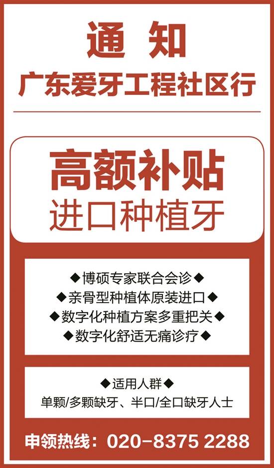 “广东爱牙工程社区行”由广东省临床医学学会携手德伦口腔共同推进“粤口腔健康”建设,为了让缺牙街坊重新拥有好牙享口福,针对缺牙、无牙等口腔问题,提供多方面的公益援助,帮助市民解决牙齿问题。市民均可拨打020-8375 2288申领种牙补贴,实现健康好牙梦想。