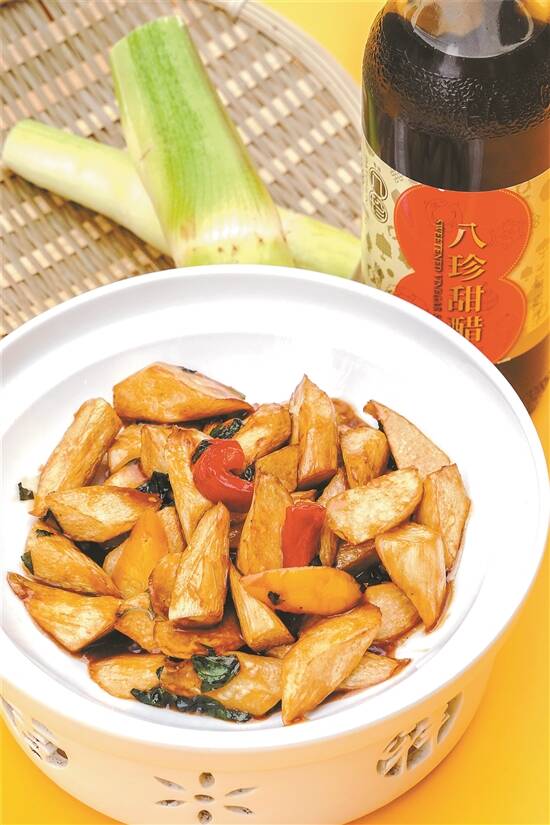 为了迎接夏季到来,该餐厅推出多个创意新品。其中一道八珍甜醋茭白,甜醋来自香港,用天然米醋加入多种香料经过长时间熬制,据介绍能提升钙质吸收、帮助血液循环。酸甜可口的甜醋,搭配爽脆清甜的茭白,上桌前再撒一把九层塔,香味独特,十分诱人。