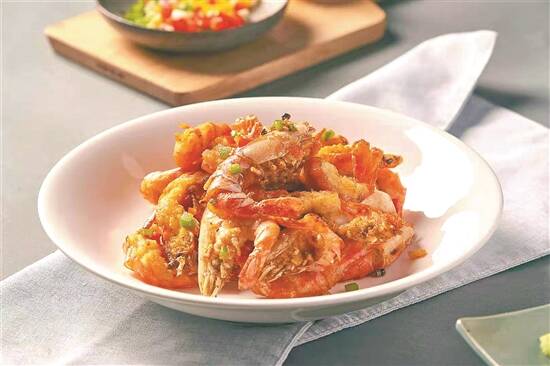 佛山希尔顿酒店御玺中餐厅在“五一”假期特别推出新菜“瑞雪藏龙”,大厨采用基围虾和龙虾,用剥出的虾壳熬制龙虾汤底,而龙虾肉则在汤中慢慢浸熟,上盘时加上黑、红鱼子做装饰,雪白的龙虾肉加龙虾汤蒸蛋,入口鲜嫩顺滑,加上鱼子在口中爆开,满口咸鲜,为龙虾肉提鲜,口感十分丰富。