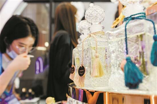 消博会现场,一个女士在彩妆区试香水 主办方供图