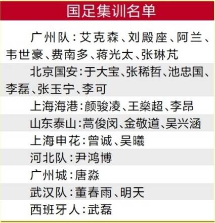 羊城晚报讯 记者林本剑报道:昨日,中国足协公布了新一期中国男足国家队的集训名单,共有26名球员上榜,其中,广州队共有7人入选此次名单,成为贡献国脚第一大户。北京国安也有6人入选,另外,效力于西班牙人的武磊也榜上有名。国足将于5月14日集中,备战将于5月底进行的2022年卡塔尔世界杯亚洲区预选赛40强赛的比赛。