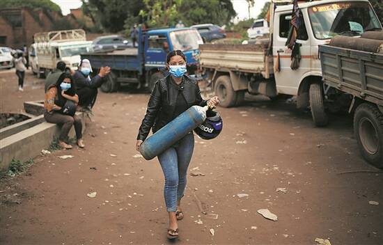 5月13日,一名尼泊尔女子在加德满都搬运氧气罐。
