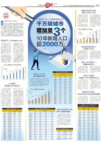 数据显示,10年来,广东平均每年增加217.09万人,年平均增长率为1.91%,增速与上一个十年的年均增速(1.90%)基本持平。自2007年以来,广东连续14年常住人口规模居全国首位,占全国总人口的比重从2010年的7.79%提高到8.93%,提高1.14个百分点。