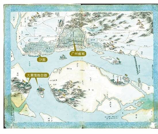 1841年3月5日,英军下发了兵分两路进军的命令,其中,摩底士底号带领前锋舰队经沥滘水道进军,西分队则走大石水道。或许是因为近广州城时要行经大黄滘,所以《英军在华作战记》中将沥滘水道也称作大黄滘水道。大黄滘(又称大王滘),是指白鹅潭以南、珠江东塱段的龟岗岛,岛中与江岸上均建有炮台群。“猎德大王滘,珠江两咽喉”,都是拱卫广州城的要塞,被英军视为眼中钉。