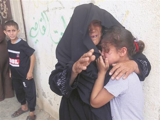 17日,在加沙地带拉法举行的一场葬礼上,在以军空袭中丧生的巴勒斯坦人的亲属悲痛不已 新华社发
