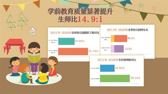 与高速增长的幼儿园学位规模相比,幼儿园教职工数的增长速度更为迅猛,体现了学前教育质量的显著提升。全省幼儿园教职工数从2011年的27.0万人,增长到2020年底的61.1万人;专任教师从15.0万人增长到2020年底的32.1万人,十年间教职工数和专任教师数增长了一倍,生师比从20.6:1缩小到14.9:1。