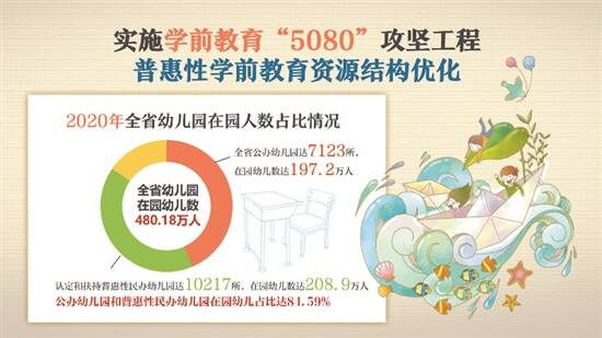 全省学前教育经费保障能力明显增长。2020年,全省学前教育经费总投入为484.28亿元,是2011年的4.25倍,明显高于在园幼儿数增幅。在各级各类教育中,学前教育经费增幅最快。省财政也持续加大对学前教育投入力度,发挥示范引导作用。2018-2020年省财政安排学前教育专项奖补经费分别为5.75亿元、7.9232亿元和12亿元,年均增长44.62%。