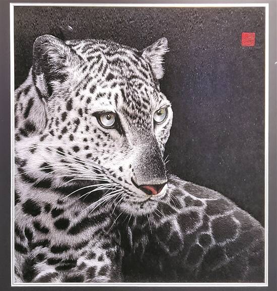本次展出的作品是由湘绣代表性传承人袁苹带领的团队花了三年时间完成的。其中一幅名为《豹》的作品在现场备受关注。