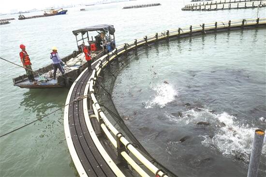 “通过风浪潮汐等自然力量消耗和分解养殖带来的影响,同时通过有序投放,控制密度,不超过水体净化能力养殖,实现无污染是深水网箱养殖的一大优点。”国联水产公司副总裁李国通表示,目前国联水产大力发展深水网箱养殖业,并随着养殖规模扩大、产业链配套成熟以及装备成熟,深水网箱养殖不断走向深远海养殖,将优质的鱼类产品供应给全国。