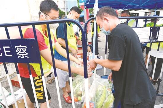 广船鹤园小区,志愿者从外卖员手中接过居民下单的物品 羊城晚报记者 陈秋明 摄