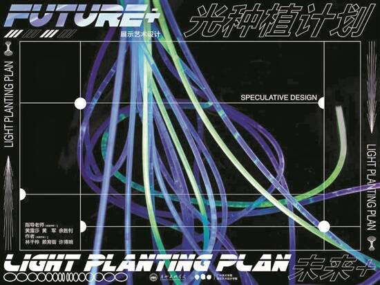 林千桦、许博婉、赖育锴的《光种植计划》设想未来人类移居海底,因光源稀缺而十分重视光,将光作为作物进行栽培,形成光文化。作品根据海底发光生物体内的荧光素能与荧光素酶发生反应,以及发光生物会对光源刺激做出反应的现象,将其运用到装置之中,设想人类可以通过自己的贡献促使光作物生长壮大。有趣的是,观众可以通过自带的光源照射装置启动光作物生长,最终得到光的产物。作品旨在通过人和光影的互动,引起大家对于海底生活的畅想,以及对当下人与环境问题的反思,同时探讨自然环境与人、科技、社会的未来相处模式。