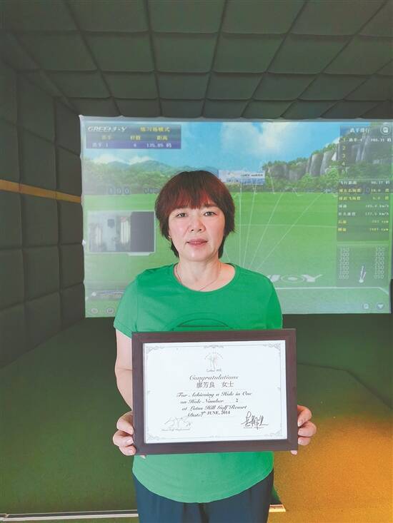 在同一个球场的不同的成绩中,最让她难忘的是2014年6月9日的一击:当时,芳姐与好友深姐在莲花山球场2号洞同组挥杆,结果芳姐实现了人生的第一次一杆进洞!当天晚上,芳姐宴请了很多好友,大家也替芳姐开心,纷纷嚷着和芳姐合影留念,希望一杆进洞的幸运也会降临到自己身上。