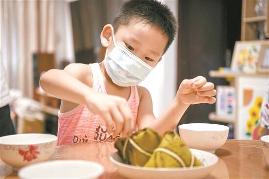 13日,广州市荔湾区东漖街道芳和花园隔离在家的小朋友准备吃粽子 羊城晚报记者 梁喻 汤铭明 摄