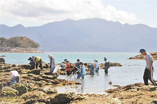 师生在鹅洲岛采集贝类等海洋生物 图/陈亮