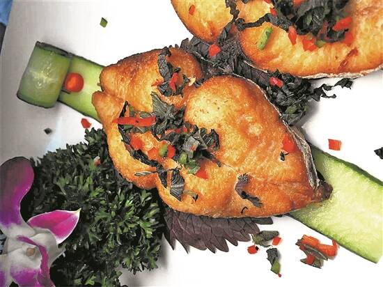 广州农科所餐厅的紫苏香煎马鲛鱼在运用紫苏这一芳香蔬菜上也可以说是恰到好处:马鲛鱼肉质肥厚,味道鲜美、营养丰富,被称为“最有营养的十种海洋鱼类之一”。用少许盐腌好再煎,只放紫苏,用最简单和原始的方式烹煮就能赢得一众食客的好评:紫苏味浓,马鲛肉质紧密、不老不柴、没有半点腥味,紫苏的独特香气和来自大海的天然鲜香简直是绝配。