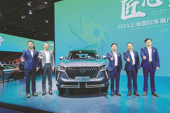 广汽集团董事长曾庆洪(右三)、广汽集团总经理冯兴亚(左二)、广汽乘用车总经理张跃赛(右二)、广汽研究院院长吴坚(左一)、广汽埃安总经理古惠南(右一)与传祺GS4 PLUS合影