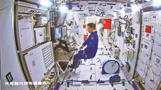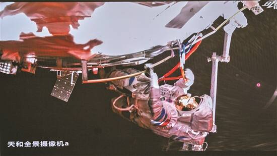 神舟十二号航天员刘伯明、汤洪波从空间站天和核心舱节点舱成功出舱,身上穿着的我国自主研制的“飞天”舱外航天服在太空中格外醒目。
