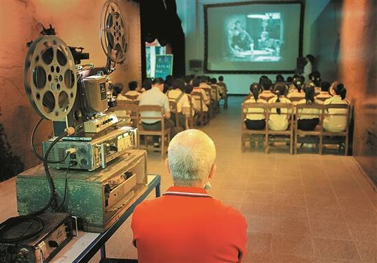 博物馆内甚至设置了一个可以容纳50人的老电影放映厅。“放映厅按照2004年被拆除的花山公社礼堂布置。”每当有村民组队、学生团体参观或亲人相聚想感受老电影情怀时,江定燎和妻子都会用放置在放映室的井冈山104型的双机电影放映机露一手。