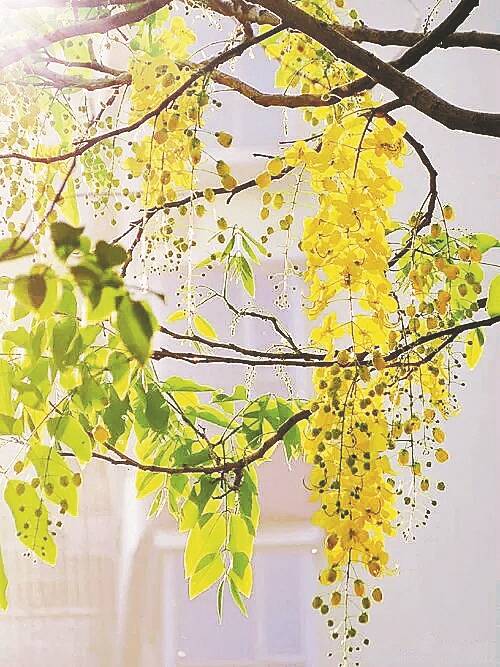 这是邱方这本书中写过画过的花。翻开书,先找到写腊肠花这一篇:“一树一树的黄花,一串串垂挂着,宛如一串串风铃,在风中摇头晃脑地歌唱;又像无数的蝴蝶在聚会,在阳光下闪着金色的光芒,又清新又俏皮。”每天,她就是在这条路上班下班,从家到出版社。夏日突如其来的暴雨中,金色的腊肠花随雨点纷纷而落,腊肠花便又有一个好听的名字,叫“黄金雨”。雨中从这条落满腊肠花的路上,她走回家,或走到办公室,发现鞋子和裙子上,沾满了腊肠花金色的花瓣。她说:“落花不逐流水,却来逐我衣,心里是有小小惊喜的。”腊肠花,和她有缘。