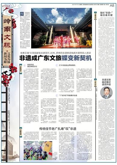 历史上,广东非物质文化遗产有着与旅游交互融合的良好传统。粤绣、佛山陶瓷公仔、香云纱等是传统文旅商品,粤剧、波罗诞、舞狮等则是重要的文旅活动、娱乐项目。一批依托非物质文化遗产的文旅产品不断涌现,如珠村的乞巧节、客家山歌节等。同时,更有阳江开渔节、河源花灯节等一大批现代节庆赓续传统非物质文化遗产,成为新时代文旅融合中的一抹亮色。