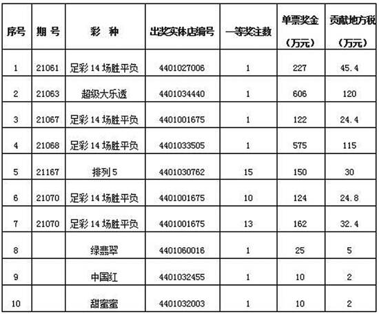 而这45注是由10位幸运儿分别中出。除了3位顶呱刮即开票头奖得主之外,其余7位幸运儿奖金均超百万元。令人惊讶的是,越秀区寺右新马路的同一家体彩实体店,在不到10天的时间内,竟然诞生了3个14场胜负彩百万元大奖。其中6月27日开奖的胜负彩第21068期,白云区景泰直街47号首层101铺4401033505网点,中出全国唯一的1注500万元封顶头奖,幸运儿以复式票总计揽得奖金575万多元;第21061期,白云区怡新路115号4401027006网点彩民中出227万元大奖;6月20日开奖的第21067期,越秀区寺右新马路的4401001675网点,幸运儿以10元5注单式票,中得122万元头奖;而6月28日开奖的第21070期,同样是越秀区寺右新马路的4401001675网点,爆出多达23注12万多元一等奖,幸运儿以单式倍投方式,分别击中124万元、162万元大奖。