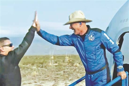 “新谢泼德”着陆后,贝索斯(右)走出飞行器庆祝 新华社发