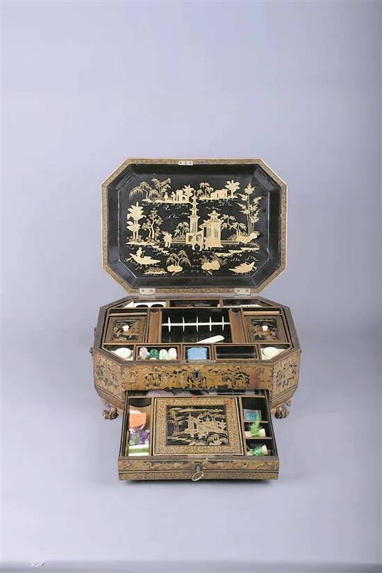 记者了解到,该礼盒的设计灵感来自广州博物馆馆藏的国家二级文物——清·黑漆描金开窗庭院人物图缝纫盒,并以此为原型改良制作而成。整体感觉清雅不俗、雍容瑰丽。