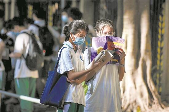 等候进入考场的学生翻看复习资料 羊城晚报记者 梁喻 实习生 方宁 摄
