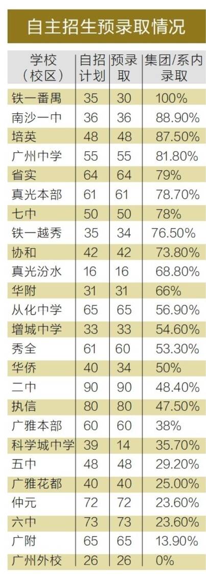 记者梳理发现,15所学校(校区)自招嫡系生源超过50%,其中华南师范大学附属中学(下称“华附”)、广东实验中学(下称“省实”)面向集团、系内或初中部录取率分别达65%、79%,广州市铁一中学(下称“铁一”)番禺校区100%集团内录取。