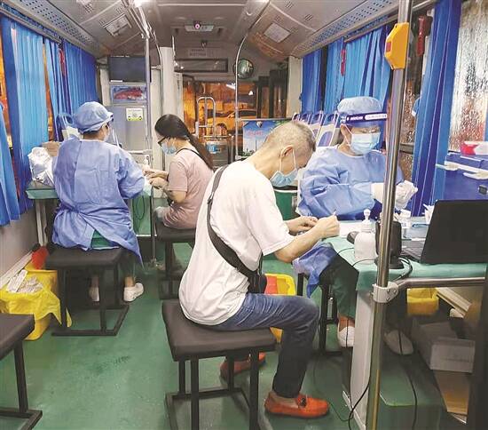 羊城晚报讯 记者余燕红、通讯员黄璀玥摄影报道:自今年5月起,广州多个区推出新冠病毒疫苗移动便民接种车服务。8月6日,由荔湾区骨伤科医院负责服务的移动接种专车,再次开入河沙联社开展疫苗接种工作,为市民提供优质便捷的接种服务,全力筑牢免疫屏障。