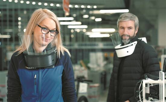 这绝对是“未来派”的高科技产品。从款式设计上已很“未来派”,像宇航员的头盔,却又是未封闭式的,或者说它更像是一个项圈。它利用两个紫外线“消毒模块”来对使用者面部周围的空气进行净化,据说已证实可以消灭99%的细菌和病毒。