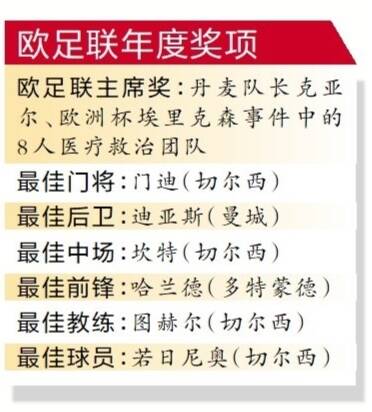 欧冠冠军和欧洲杯冠军的双料中场灵魂,若日尼奥当选欧足联年度最佳球员当之无愧。有趣的是,年度最佳球员若日尼奥司职中场,他却没有当选欧足联年度最佳中场,他的切尔西队友坎特摘走年度最佳中场奖项,而坎特并未入选上赛季欧冠最佳阵容。