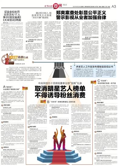 为进一步加大治理力度,重拳出击解决“饭圈”乱象问题,8月25日,中央网信办就有关工作措施,提出取消明星艺人榜单、严管明星经纪公司、规范应援集资行为等十项具体要求。