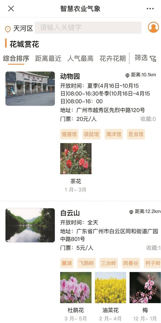 即使不从事农业作业,用户也能从“广州农业气象”中找到便民信息。记者在公众号“休闲旅游”栏目中看到,“魅力羊城”“花城赏花”和“休闲农园”三个专栏,为向往田园生活的都市人群提供景区天气及赏花指数、采摘指数、垂钓指数等气象预报服务,当季花期地图让你不再错过领略花城之美的机会。