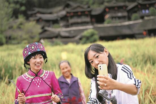 游客在湖北省宣恩县沙道沟镇彭家寨的水稻田间游玩 新华社发
