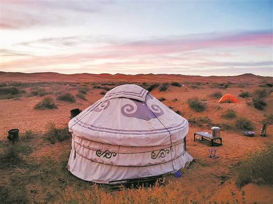 当晚我们入住牧民家的蒙古包。偌大的沙漠,放眼望去,就这么几个零星的蒙古包。没想到晚上却热闹非常。领队把大音响打开,带着众人载歌载舞地烤羊肉串,边喝酒、打牌、吃串、呼麦,边欣赏满天星河。又是一个美好的夜晚。