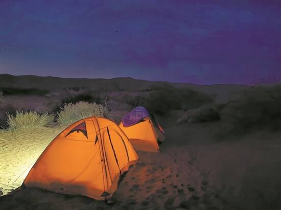 夜晚来得特别迟,晚上八时多天色才慢慢暗下去。灼热的热气开始消散,温度骤降,晚上与白天的温差竟达30℃。我们穿上早已准备好的外套大衣,依旧冻得直哆嗦。当夕阳消失在远处的沙丘后面,整座沙漠就陷入漆黑一片。我们点亮了几盏应急灯,给万籁俱寂的沙漠平添一丝神秘。但晚上十时多,却又是另外一番景象。满天星光亮起来,璀璨得如同梦境一般,整个天空弥漫着一种浪漫的、典雅的深紫色,让人惊艳,看着看着就深陷其中,忘记了白天的辛苦,忘记了夜晚的寒冷……