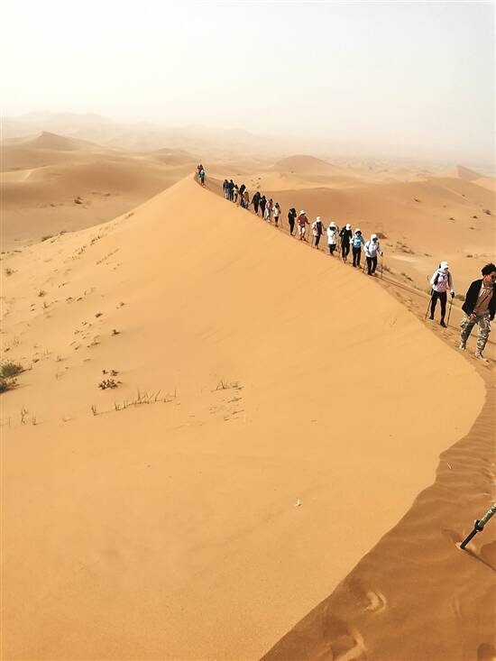 飞机降落在宁夏银川,再转坐两个多小时的大巴,就到达内蒙古阿拉善盟的腾格里沙漠。踏上沙漠的那一刻,队伍里每个人都兴奋地开始全副武装,冲锋衣、遮阳帽、头巾、面罩、冰袖、防沙鞋套等把自己裹了个严实。接下来三天,我们基本上每天从上午九时到下午三时都要行走在黄沙之上。