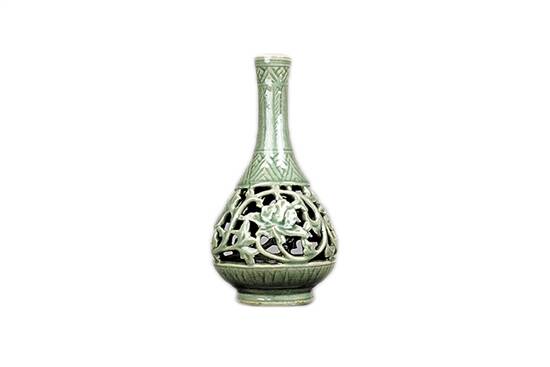此件玉壶春瓶除在器型上堪称经典外,更以瓶腹高妙的镂雕工艺反映出龙泉青瓷工艺的又一巅峰。明代初年至明中期,是龙泉窑继南宋以后的第二次发展高峰,这一时期的龙泉窑在继承元代工艺技法的基础上,发展出更为多样的装饰手法,镂雕工艺即是其中一种。该瓶瓶腹之缠枝牡丹花卉纹,可谓透雕与刻划技法的完美结合,既突出了花叶的形态,又丰富了画面的层次。此瓶的牡丹纹样纤巧灵动,枝叶穿插自然,堪称明代龙泉镂雕工艺佳品中的佼佼者。