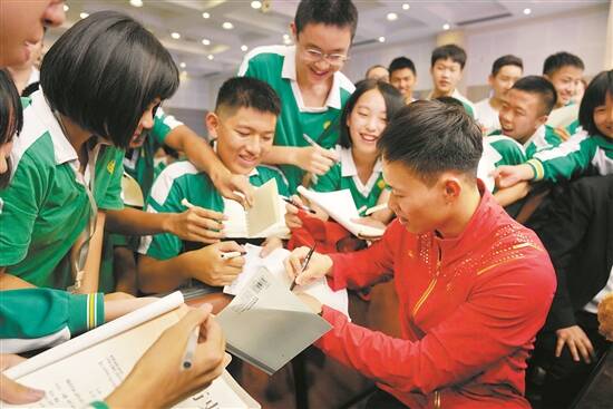 “朴实无华的本子才容易得到签名!”10月18日,东京奥运冠军谢思埸来到广州市执信中学为同学们上了一节班会课,分享如何坚持梦想,给出自己的解压锦囊。班会课尾声,同学们一拥而上“淹没”了谢思埸,请他签名。