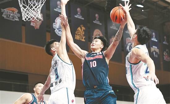 正如赵睿(右二)的这次上篮,广东队内线进攻屡屡受阻 新华社发