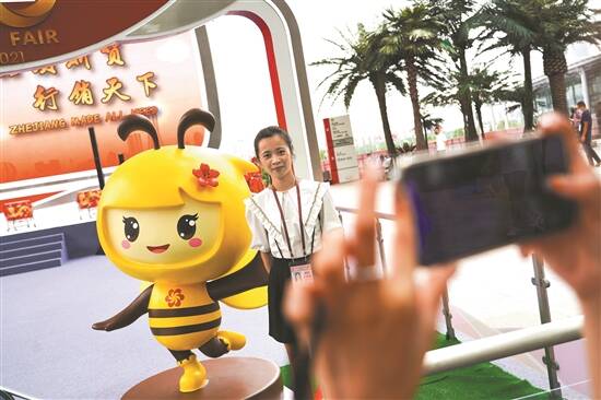 参展来宾与广交会吉祥物合影