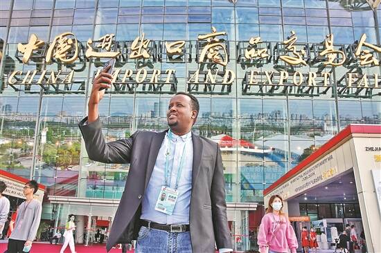 外国采购商们不忘在广交会展馆前自拍打卡 视觉中国供图